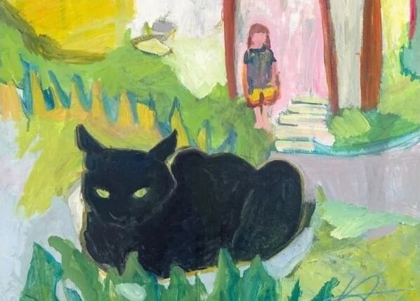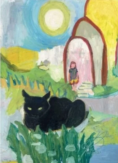 This is our cat Jazzy again, painted from memory (as opposed to using a photo reference). The painting doesn’t have a particular meaning, but the general feeling is of me as a girl, and memory, and houses. Jazzy appears to be keeping watch with her ears as well as her eyes. Dandelions feature here again - this time ready to send more dandelion seeds out into the world. The top image is a detail, and the bottom image shows the whole painting.